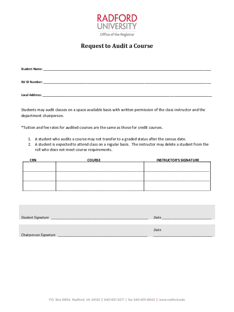 Request to Audit a CourseStudent Name: ___RU ID Number: ___Local Address: ___Students may audit classes on a space available basis with written permission of the class instructor and the