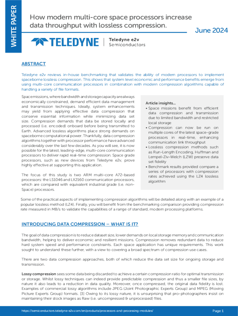 WHITE PAPERHow modern multicore space processors increase data throughput with lossless compression.June 2024ABSTRACT Teledyne e2v reviews inhouse benchmarking that validates the ability of modern