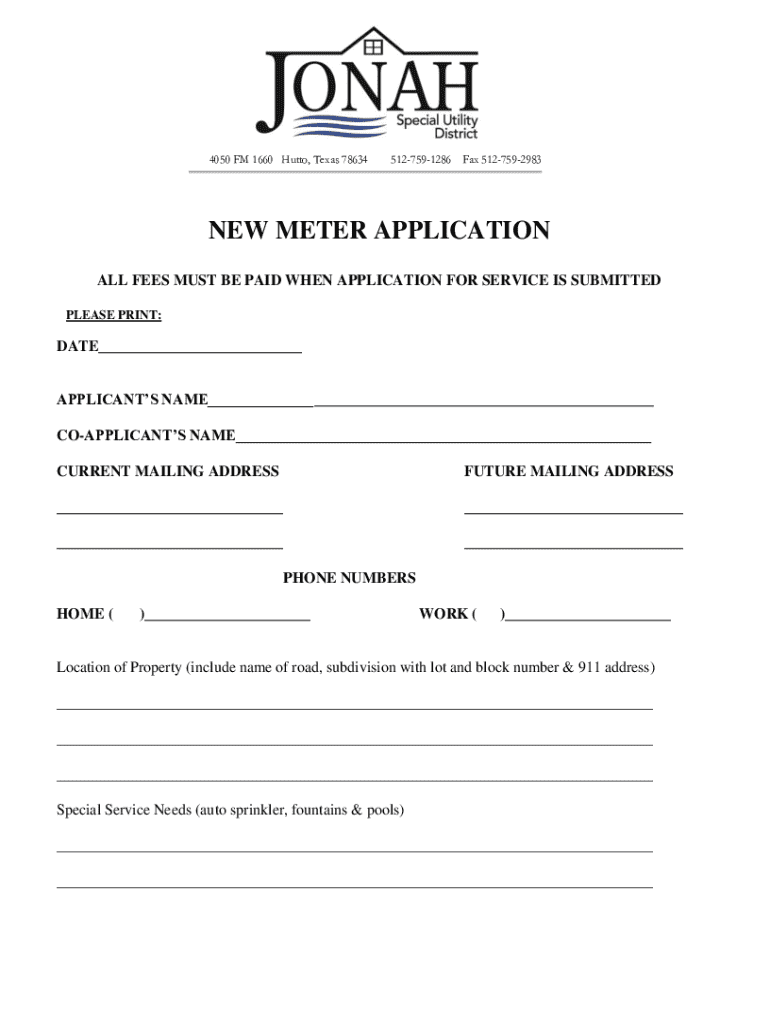4050 FM 1660 Hutto, Texas 786345127591286Fax 5127592983NEW METER APPLICATION ALL FEES MUST BE PAID WHEN APPLICATION FOR SERVICE IS SUBMITTED PLEASE PRINT:DATE___ APPLICANTS NAME___ COAPPLICANTS NAME___