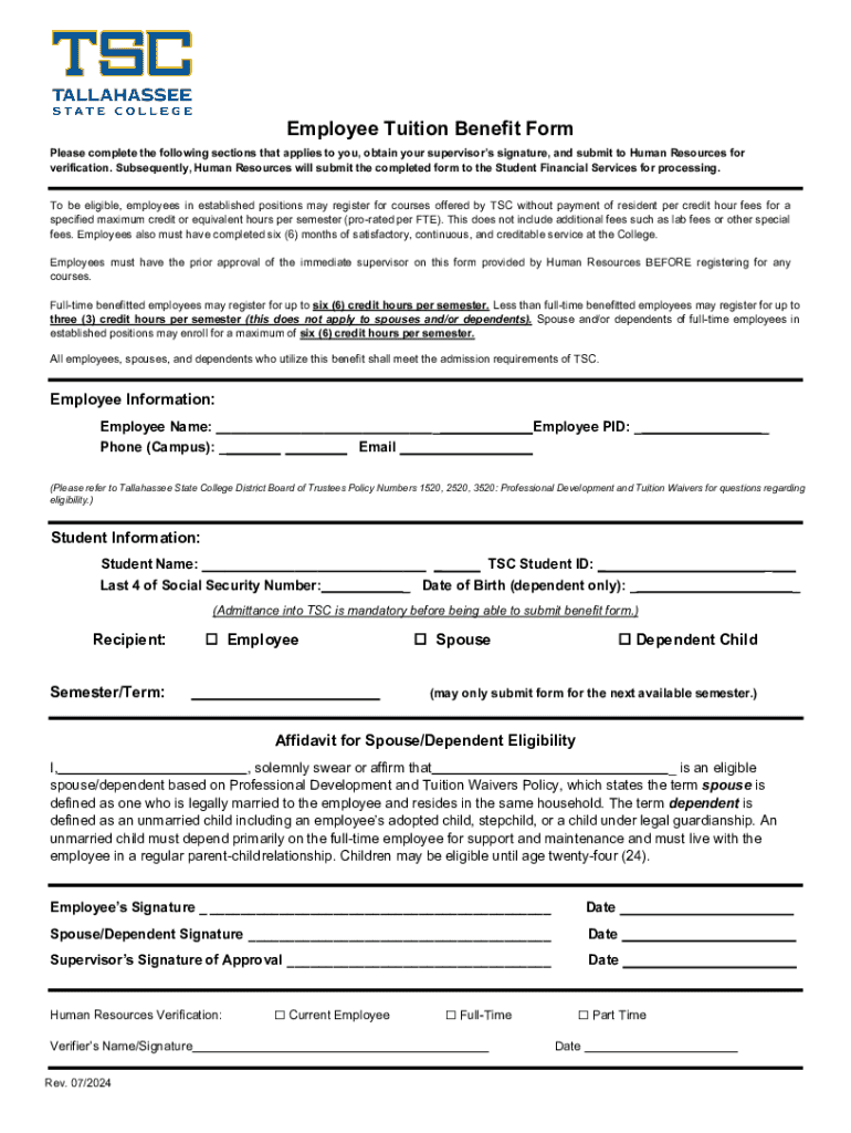 Employee Tuition Benefit Form Please complete the following sections that applies to you, obtain your supervisors signature, and submit to Human Resources for verification. Subsequently, Human Resources