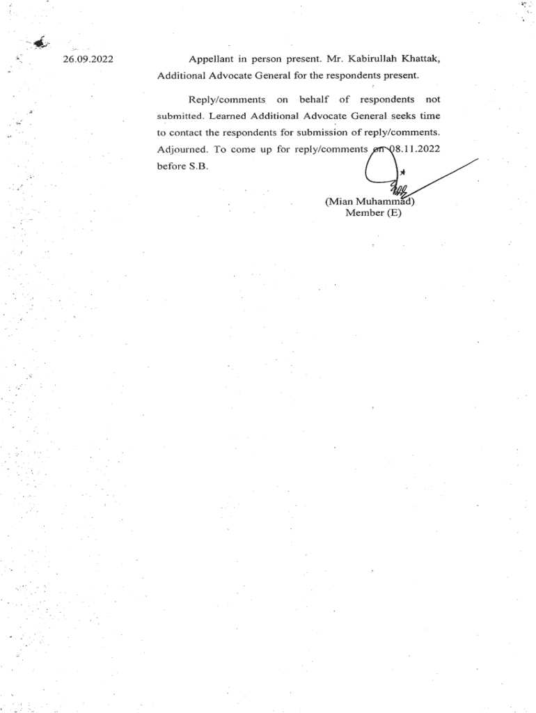 I26.09.2022.appellant in person present. Mr. Abdullah Kathak, Additional Advocate General for the respondents present. Reply/commentsonbehalf of respondentsnotsubmitted. Learned Additional Advocate