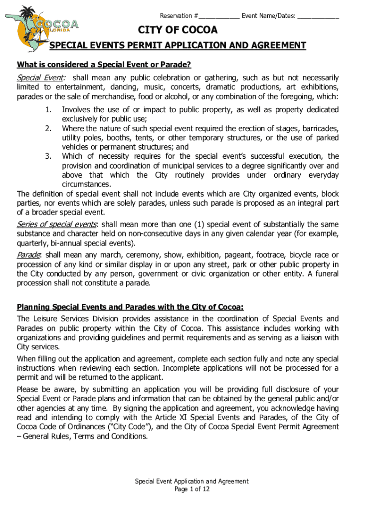Reservation #___ Event Name/Dates: ___CITY OF COCOA SPECIAL EVENTS PERMIT APPLICATION AND AGREEMENT What is considered a Special Event or Parade?Special Event: shall mean any public celebration or