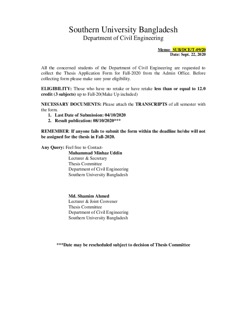 Southern University Bangladesh Department of Civil Engineering Memo: SUB/DCE/T09/20 Date: Sept. 22, 2020All the concerned students of the Department of Civil Engineering are requested to collect the