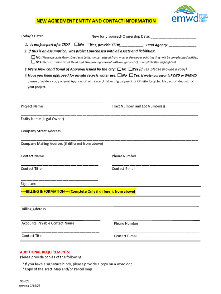 NEW AGREEMENT ENTITY AND CONTACT INFORMATION Today's Date: ___ 1. Is project part of a CFD? NoNew (or proposed) Ownership Date: ___ Yes, provide CFD#___ Lead Agency: ___2. If this is an assumption,