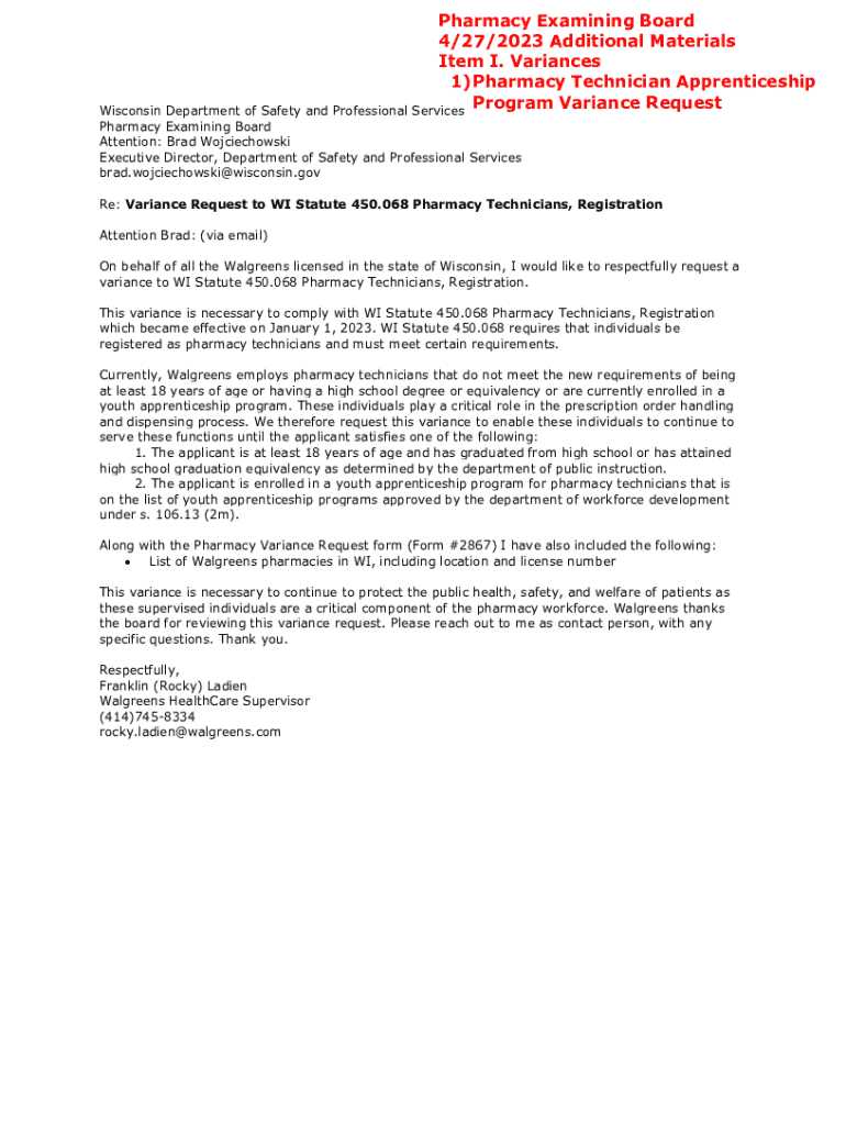 Pharmacy Examining Board 4/27/2023 Additional Materials Item I. Variances 1)Pharmacy Technician Apprenticeship Program Variance Request Wisconsin Department of Safety and Professional Services Pharmacy