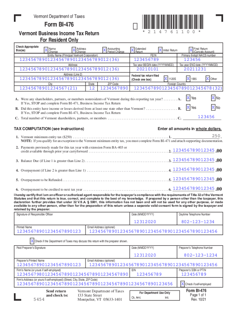 Vermont Department of Taxes*214761100*Form BI476 Vermont Business Income Tax Return For Resident Only Check Appropriate Box(es)XName X Address Change Change Entity Name (Principal Vermont Corporation)*