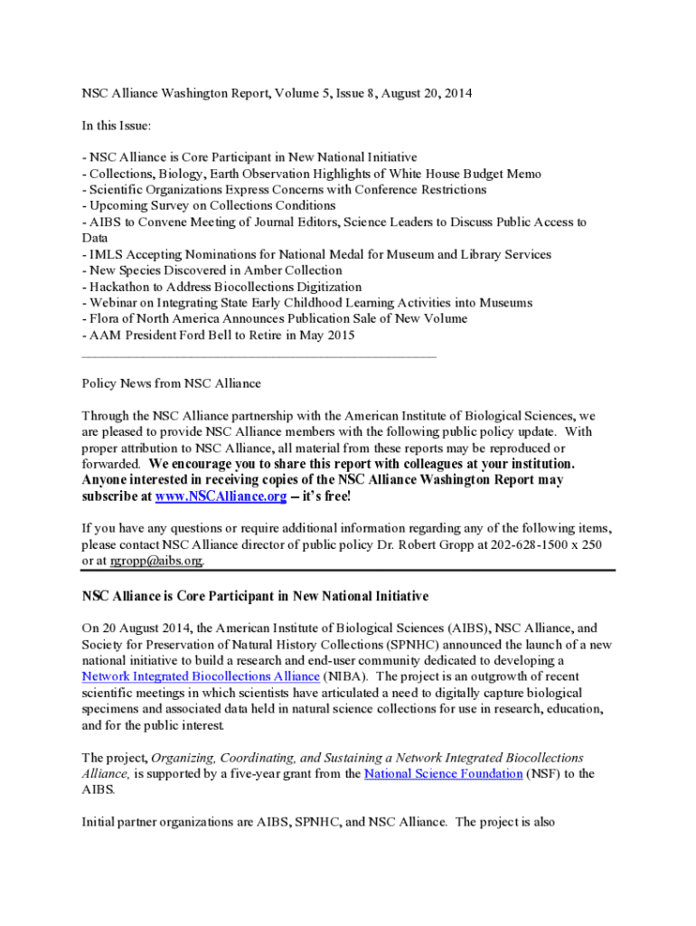 NSC Alliance Washington Report, Volume 5, Issue 8, August 20, 2014 In this Issue: NSC Alliance is Core Participant in New National Initiative Collections, Biology, Earth Observation Highlights of