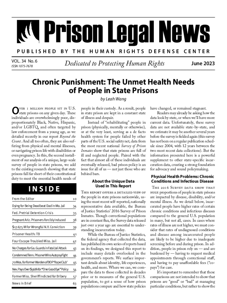 Prison Legal Republished BY THE HUMAN RIGHTS DEFENSE CENTER VOL. 34 No. 6 ISSN 10757678Dedicated to Protecting Human Rights June 2023Chronic Punishment: The Unmet Health Needs of People in State Prisons