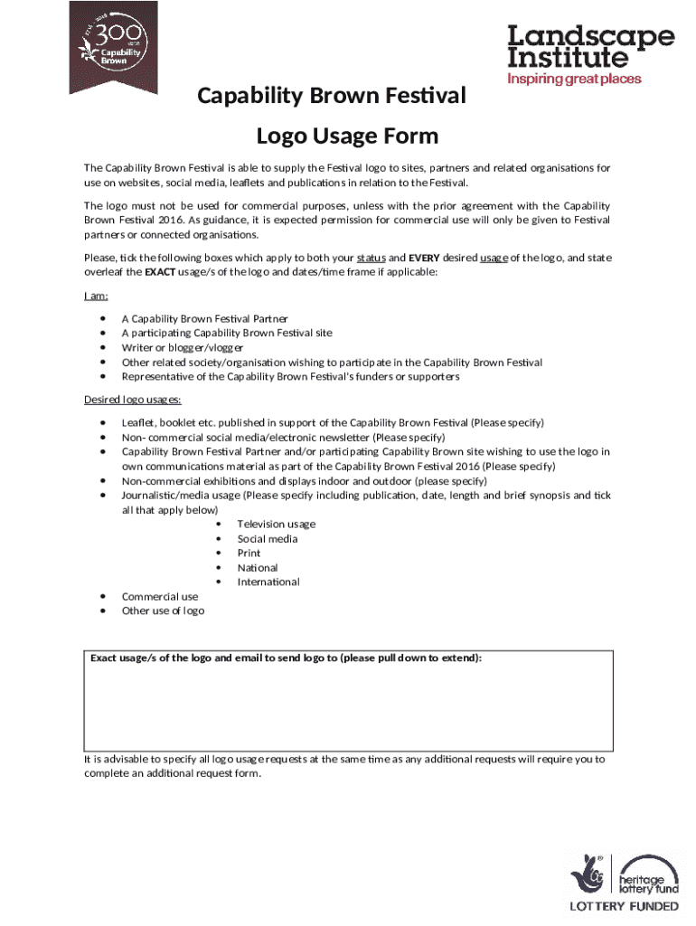 The Capability Brown Festival Logo Usage is a writable document that has to be filled-out and signed for certain purposes. In that case, it is provided to the actual addressee in order to provide some info of any kinds. The completion and signing is available manually in hard copy or using an appropriate application like PDFfiller. These applications help to send in any PDF or Word file without printing them out. It also lets you customize its appearance depending on your needs and put legit digital signature. Once you're good, you send the Capability Brown Festival Logo Usage to the respective recipient or several ones by email and also fax. PDFfiller has a feature and options that make your document of MS Word extension printable. It provides different settings for printing out appearance. It doesn't matter how you'll file a form after filling it out - physically or electronically - it will always look neat and firm. In order not to create a new editable template from the beginning all the time, make the original Word file as a template. Later, you will have a rewritable sample.