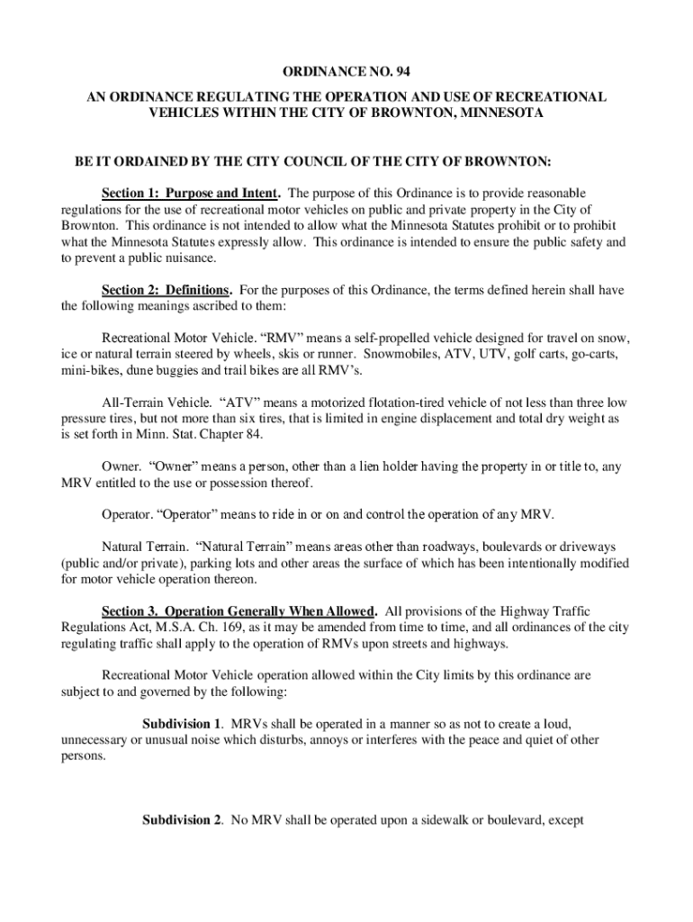 ORDINANCE NO. 94 AN ORDINANCE REGULATING THE OPERATION AND USE OF RECREATIONAL VEHICLES WITHIN THE CITY OF BRONSON, MINNESOTA IT ORDAINED BY THE CITY COUNCIL OF THE CITY OF BRONSON: Section 1: Purpose