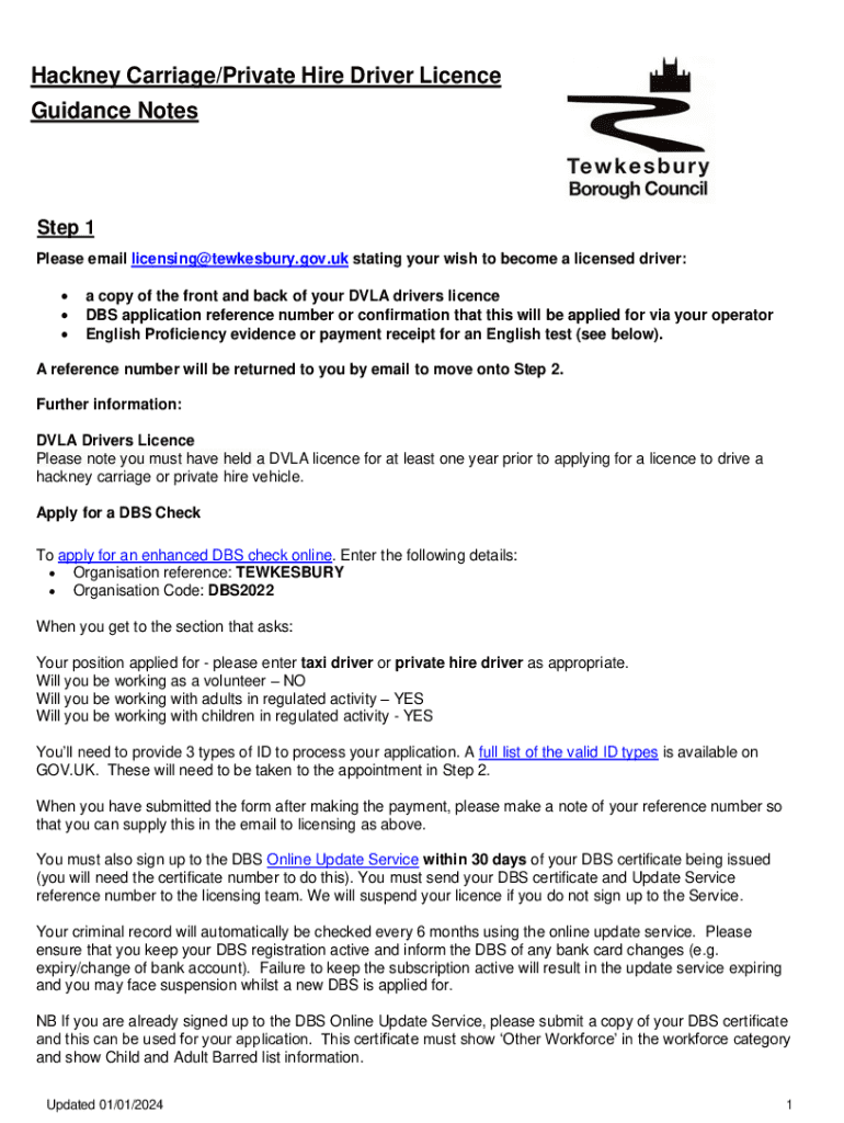 Hackney Carriage/Private Hire Driver License Guidance Overstep 1 Please email licensing@tewkesbury.gov.uk stating your wish to become a licensed driver: A copy of the front and back of your DLA driver's