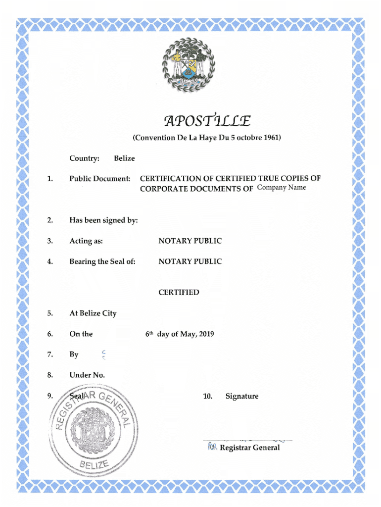 Company NameCERTIFICATE OF NOTARY TO ALL TO WHOM these presents shall come, I, ___, of address, duly authorized Notary Public of Belize, HEREBY CERTIFY that the documents hereunto annexed and listed