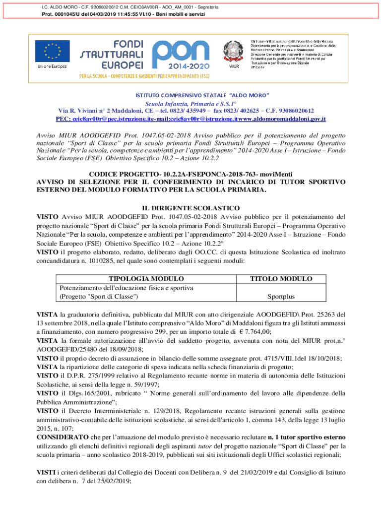 I.C. ALDO MORO C.F. 93086020612 C.M. CEIC8AV00R AOO_AM_0001 SegreteriaProt. 0001045/U Del 04/03/2019 11:45:55VI.10 Ben mobile e serviziISTITUTO COMPRESSIVE STAT ALE ALDO MORO