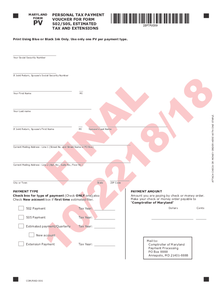 TAX AND EXTENSIONSPrint Using Blue or Black Ink Only. Use only one PV per payment type. Your Social Security Number Joint Return,