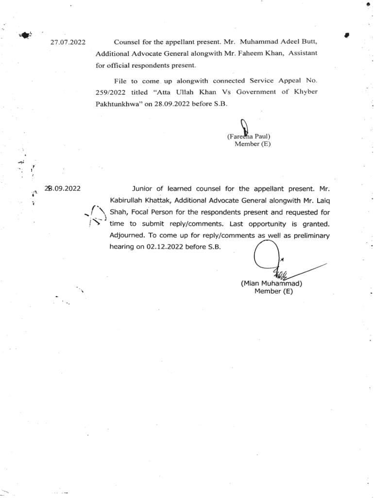 $Counsel for the appellant present. Mr. Muhammad Adeel Butt,27.07.2022Additional Advocate General alongwith Mr. Faheem Khan, Assistant for official respondents present. File to come, up alongwith