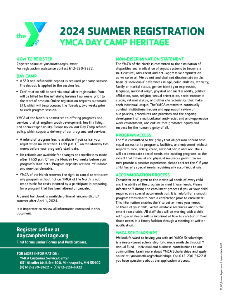 2024 SUMMER REGISTRATION YMCA DAY CAMP HERITAGE Register online at ymcanorth.org/summer. For registration assistance contact 6122309622.DAY CAMP A $50 nonrefundable deposit is required per camp session.