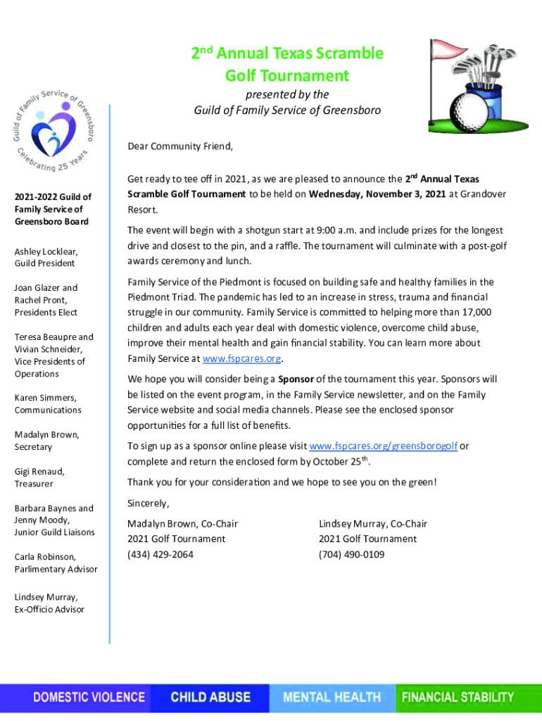 2nd Annual Texas Scramble Golf Tournament presented by the Guild of Family Service of Greensboro Dear Community Friend,20212022 Guild of Family Service of Greensboro Board Ashley Locker, Guild President
