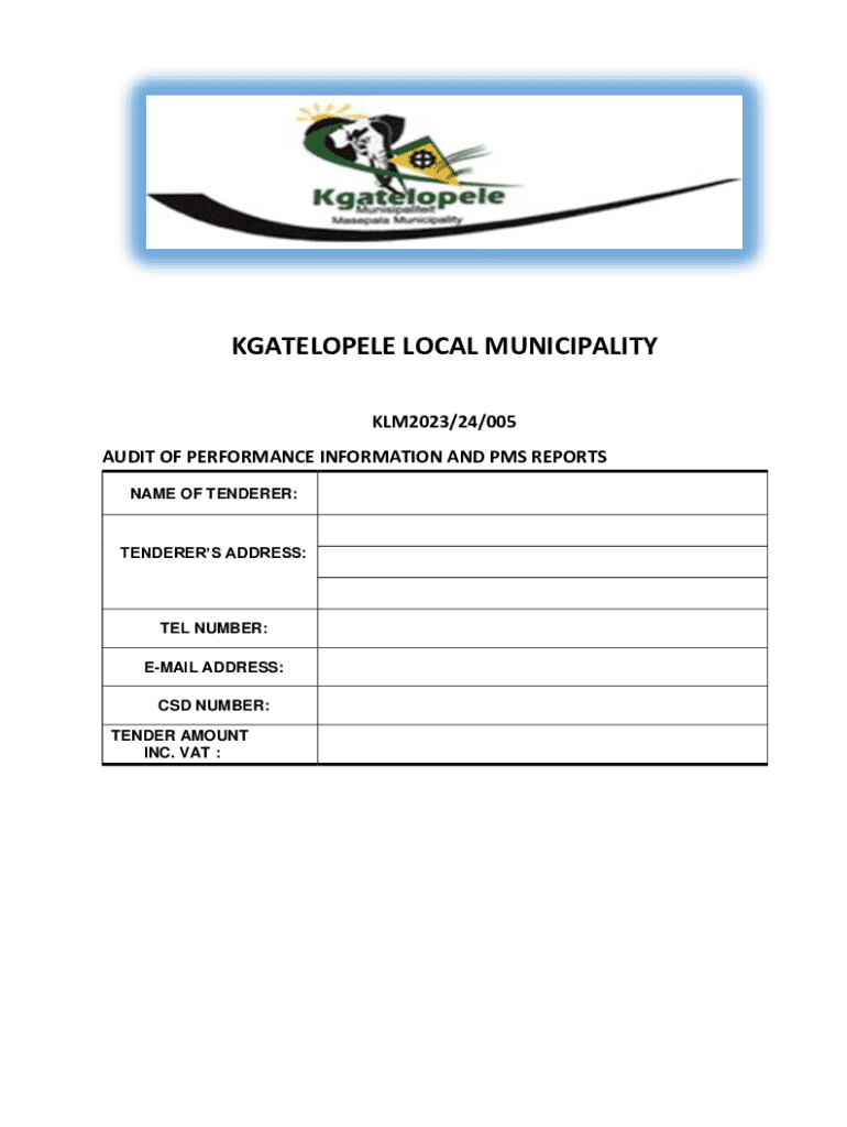 KGATELOPELE LOCAL MUNICIPALITY KLM2023/24/005 AUDIT OF PERFORMANCE INFORMATION AND PMS REPORTS NAME OF TENDERER:TENDERER ADDRESS:TEL NUMBER: EMAIL ADDRESS: CSD NUMBER: TENDER AMOUNT INC. VAT :AUDIT