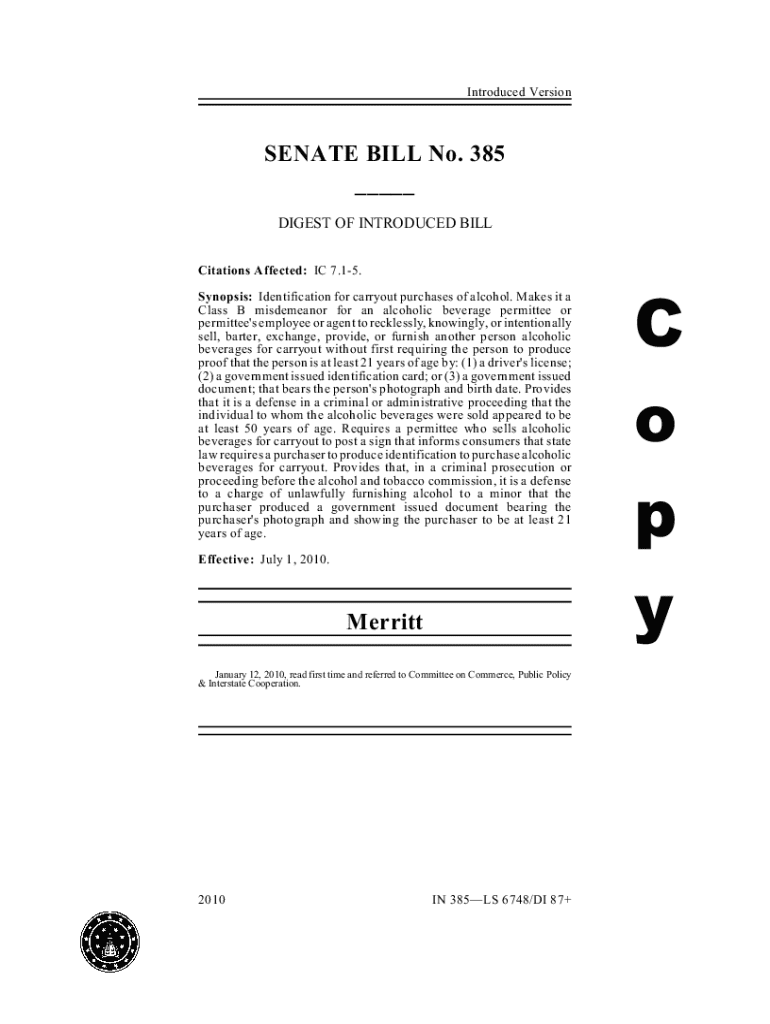 Introduced VersionSENATE BILL No. 385 ___ DIGEST OF INTRODUCED BILL Citations Affected: IC 7.15. Synopsis: Identification for carryout purchases of alcohol. Makes it a Class B misdemeanor for an alcoholic