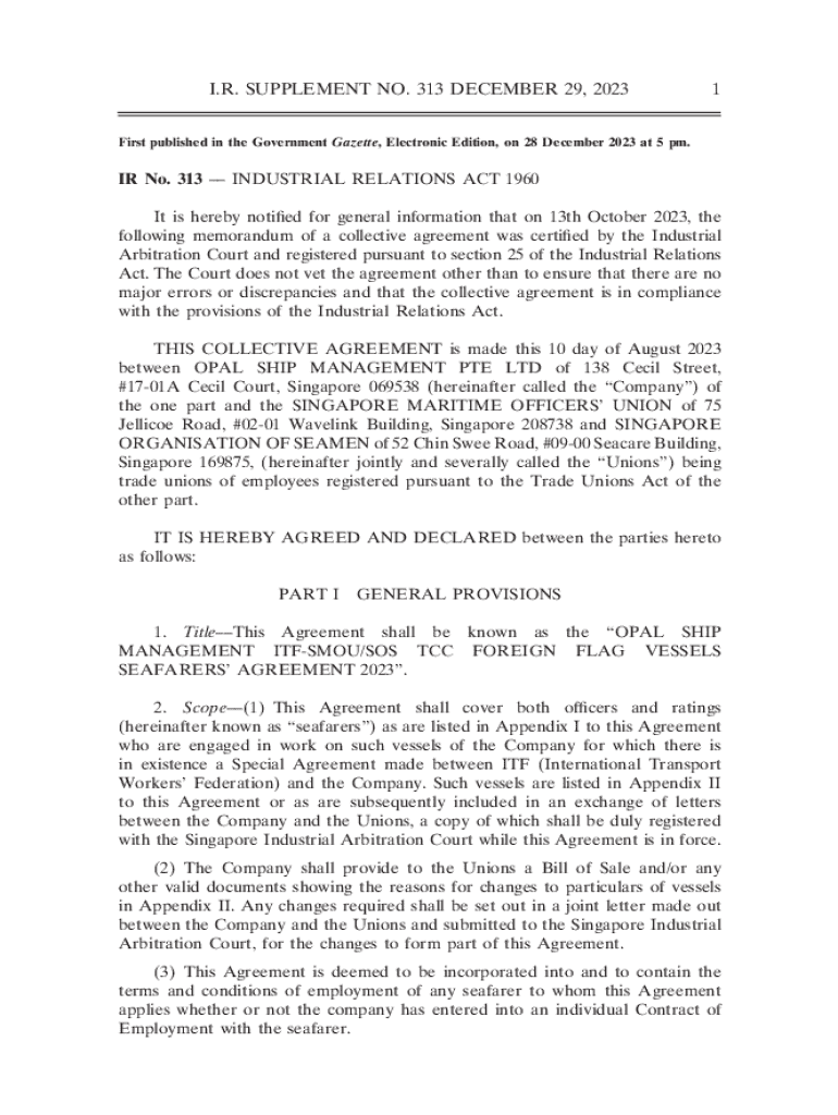 I.R. SUPPLEMENT NO. 313 DECEMBER 29, 20231First published in the Government Gazette, Electronic Edition, on 28 December 2023 at 5 pm.IR No. 313 INDUSTRIAL RELATIONS ACT 1960 It is hereby notified