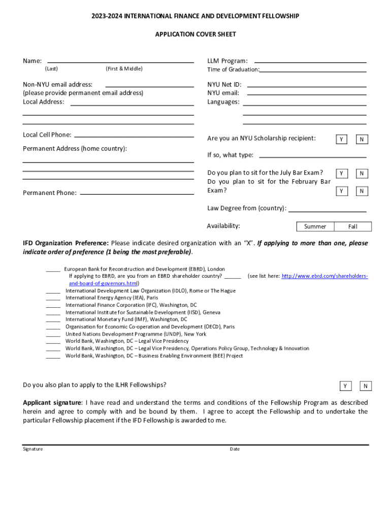 20232024 INTERNATIONAL FINANCE AND DEVELOPMENT FELLOWSHIP APPLICATION COVER Sheena:ELM Program: (Last)(First & Middle)Time of Graduation:NonNYU email address: (please provide permanent email address)