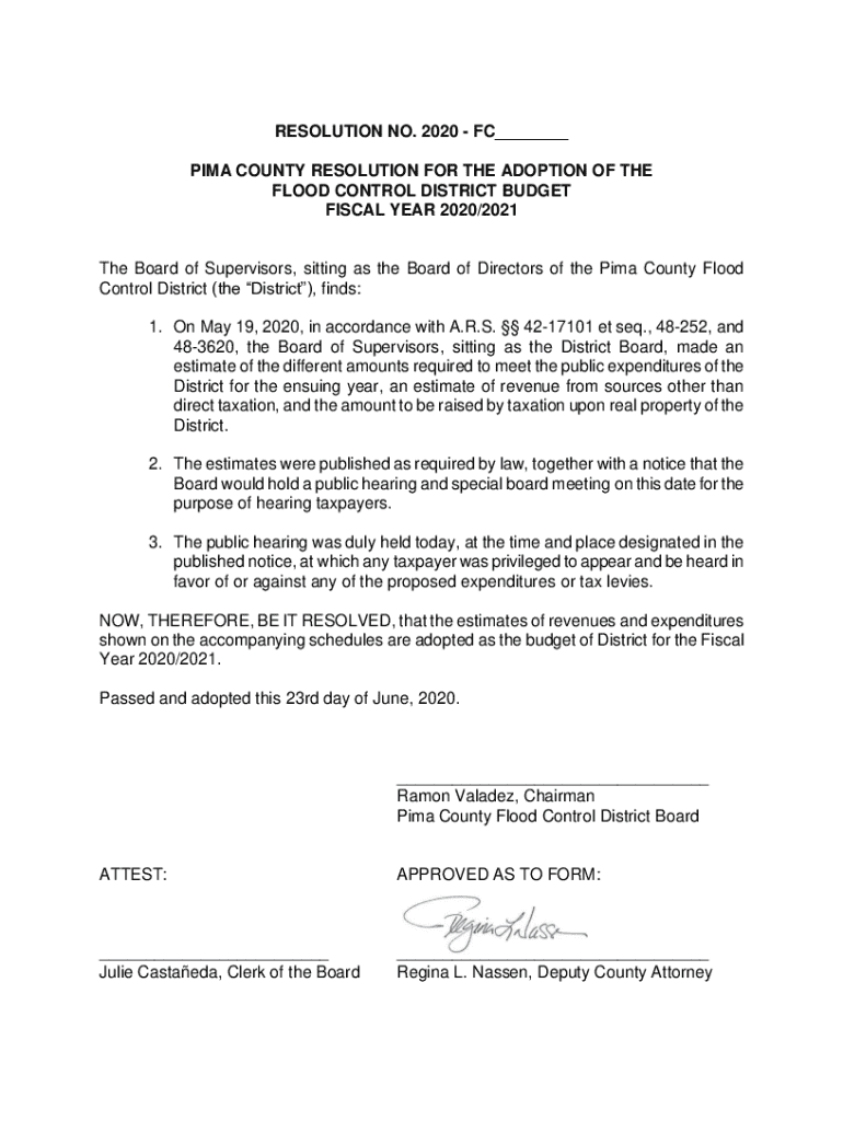 RESOLUTION NO. 2020 FC___ PIMA COUNTY RESOLUTION FOR THE ADOPTION OF THE FLOOD CONTROL DISTRICT BUDGET FISCAL YEAR 2020/2021The Board of Supervisors, sitting as the Board of Directors of the Pima