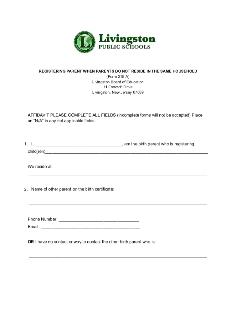 REGISTERING PARENT WHEN PARENTS DO NOT RESIDE IN THE SAME HOUSEHOLD (Form 218A) Livingston Board of Education 11 Fox croft Drive Livingston, New Jersey 07039AFFIDAVIT PLEASE COMPLETE ALL FIELDS (incomplete