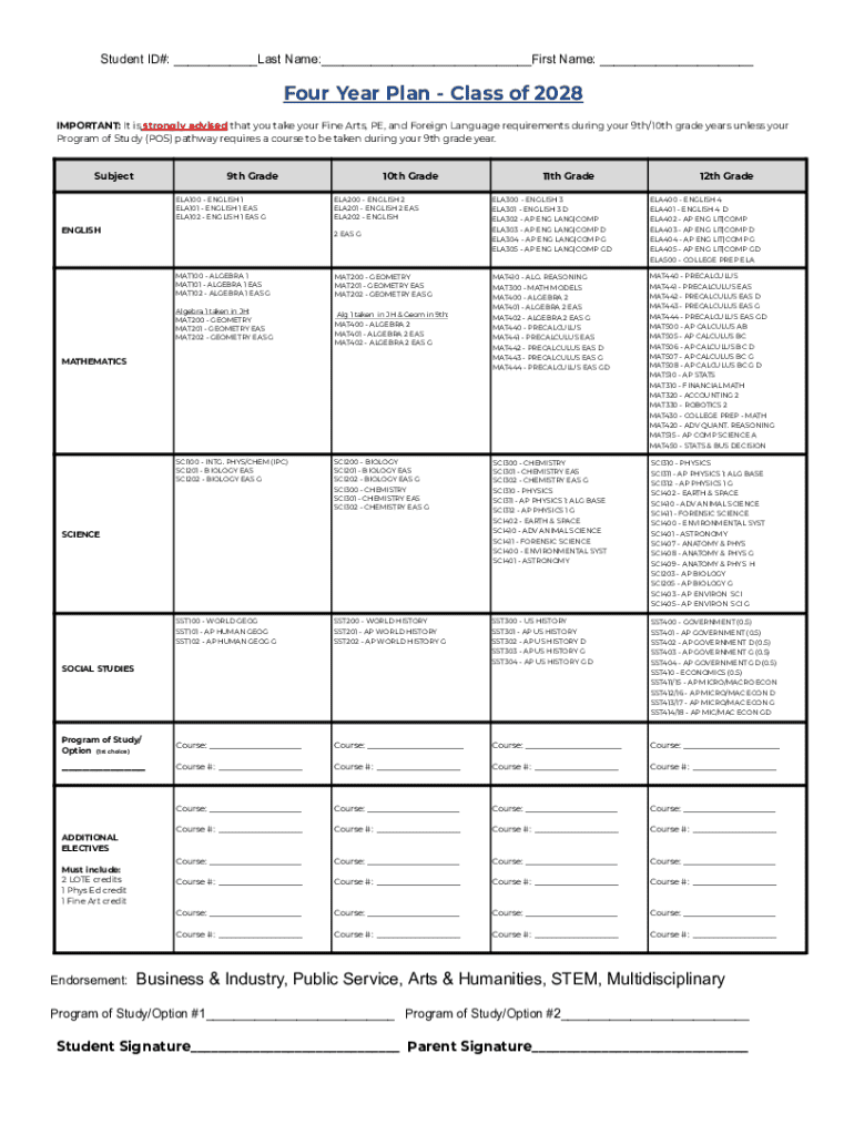 Student ID#: ___Last Name:___First Name: ___Four Year Plan Class of 2028 IMPORTANT: It is strongly advised that you take your Fine Arts, PE, and Foreign Language requirements during your 9th/10th
