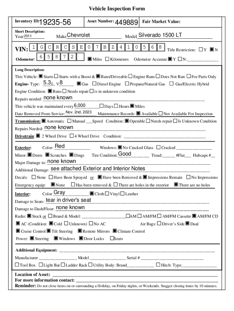 Vehicle Inspection Form1923556Inventory ID:Short Description:Asset Number:449889Fair Market Value:Chevrolet Silverado 1500 LT Make___ Model___2011 Year___1 Do G notCcloseRitems C onSor surrounding