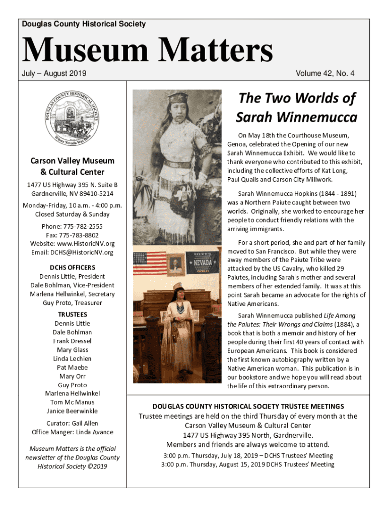 Douglas County Historical SocietyMuseum Matters July August 2019Volume 42, No. 4The Two Worlds of Sarah Winnemucca Carson Valley Museum & Cultural Center 1477 US Highway 395 N. Suite B Gardnerville,