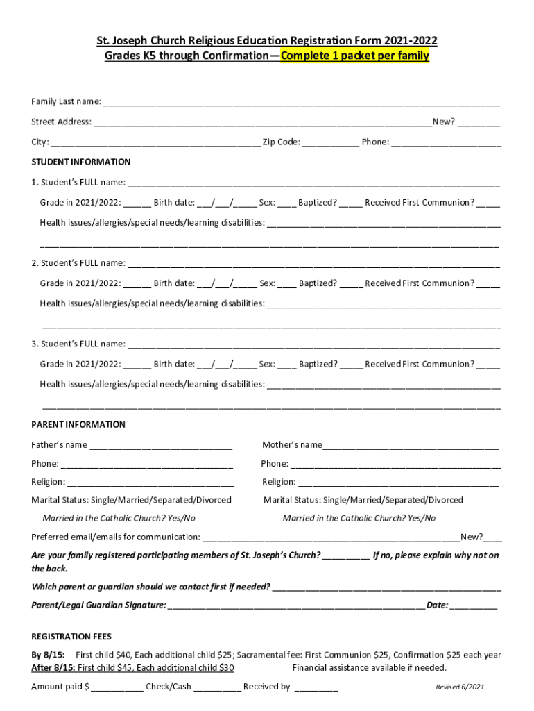 St. Joseph Church Religious Education Registration Form 20212022 Grades K5 through ConfirmationComplete 1 packet per familyFamily Last name: ___ Street Address: ___New? ___ City: ___ Zip Code: ___