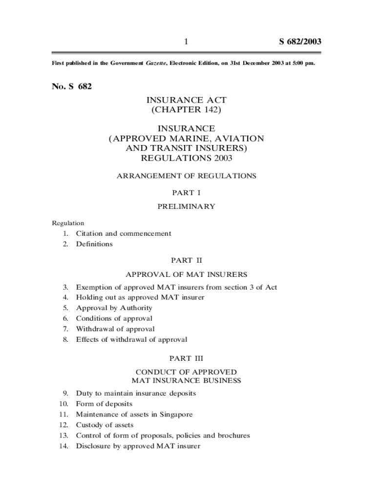 1S 682/2003First published in the Government Gazette, Electronic Edition, on 31st December 2003 at 5:00 pm.NO. S 682 INSURANCE ACT (CHAPTER 142) INSURANCE (APPROVED MARINE, AVIATION AND TRANSIT INSURERS)