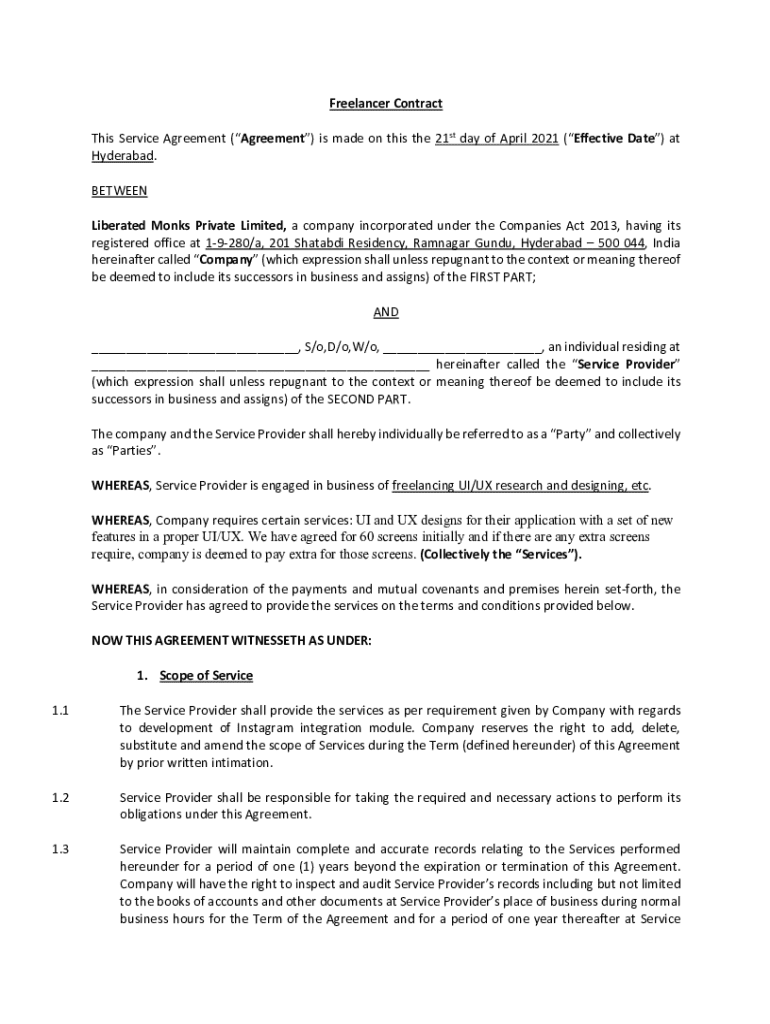 Freelancer Contract This Service Agreement (Agreement) is made on this the 21st day of April 2021 (Effective Date) at Hyderabad. BETWEEN Liberated Monks Private Limited, a company incorporated under