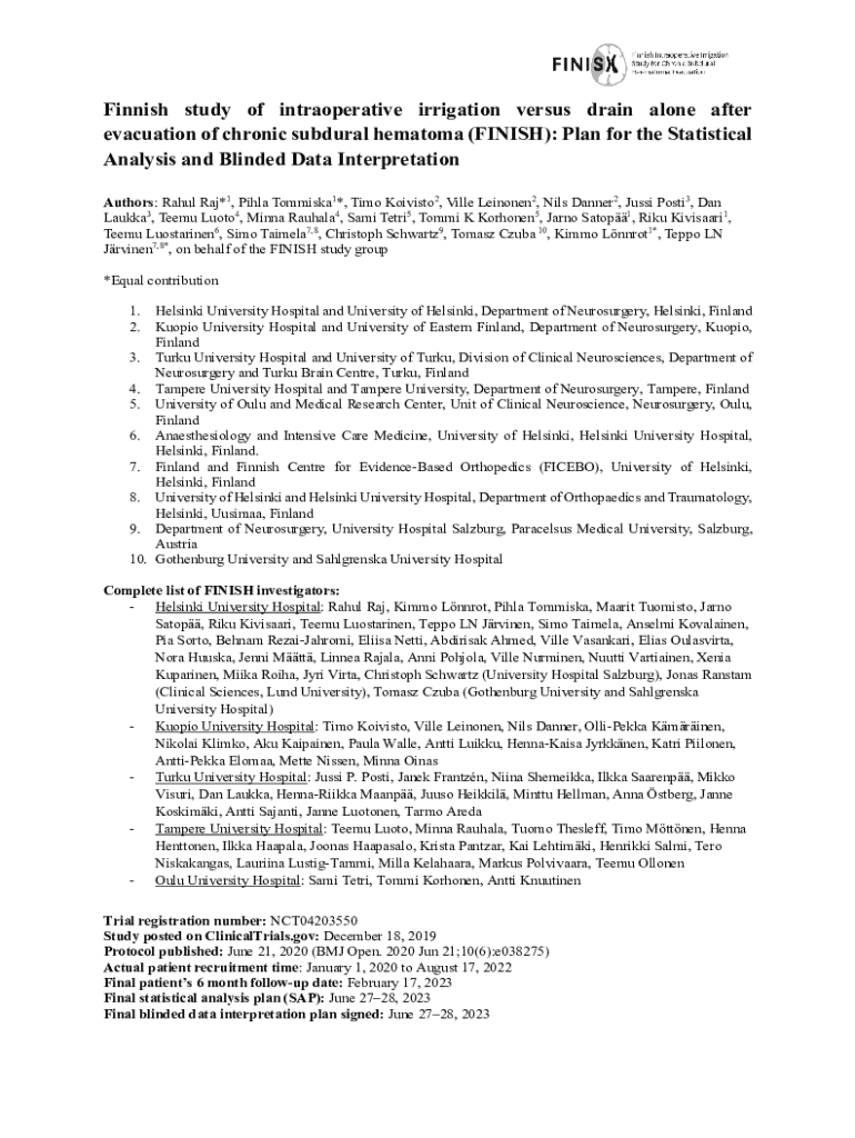 Finnish study of intraoperative irrigation versus drain alone after evacuation of chronic subdural hematoma (FINISH): Plan for the Statistical Analysis and Blinded Data Interpretation Authors: Rahul