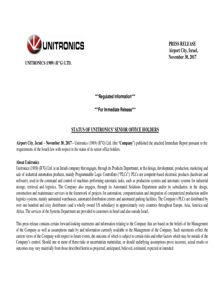 PRESS RELEASE Airport City, Israel, November 30, 2017, UNIRONIC (1989) (R\”G) LTD.***Regulated Information*** ***For Immediate Release***STATUS OF UNIRONIC SENIOR OFFICE HOLDERS Airport City, Israel