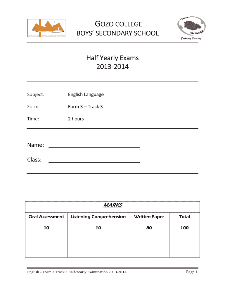 GOZOCOLLEGE BOYSSECONDARYSCHOOL Embracing Diversity HalfYearlyExams 20132014 Subject: EnglishLanguage Form: Form3Track3 Time: 2hours Name: Class: MARKS Oral Assessment Listening Comprehension Written