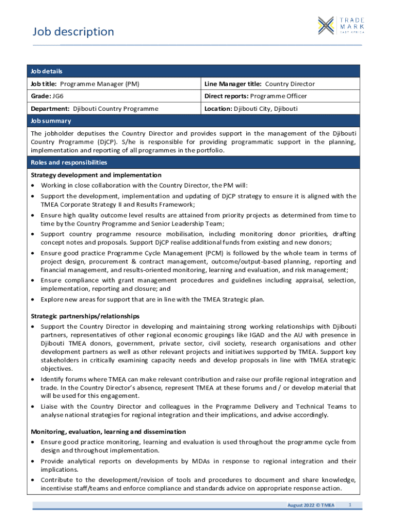 Job title: Program Manager (PM)Line Manager title: Country Directorate: JG6Direct reports: Program OfficerDepartment: Djibouti Country ProgrammeLocation: Djibouti City,