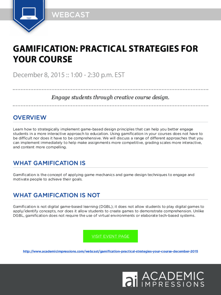 WEBCASTGAMIFICATION: PRACTICAL STRATEGIES FOR YOUR COURSE December 8, 2015 :: 1:00 2:30 p.m. EST Engage students through creative course design.OVERVIEW Learn how to strategically implement gamebased
