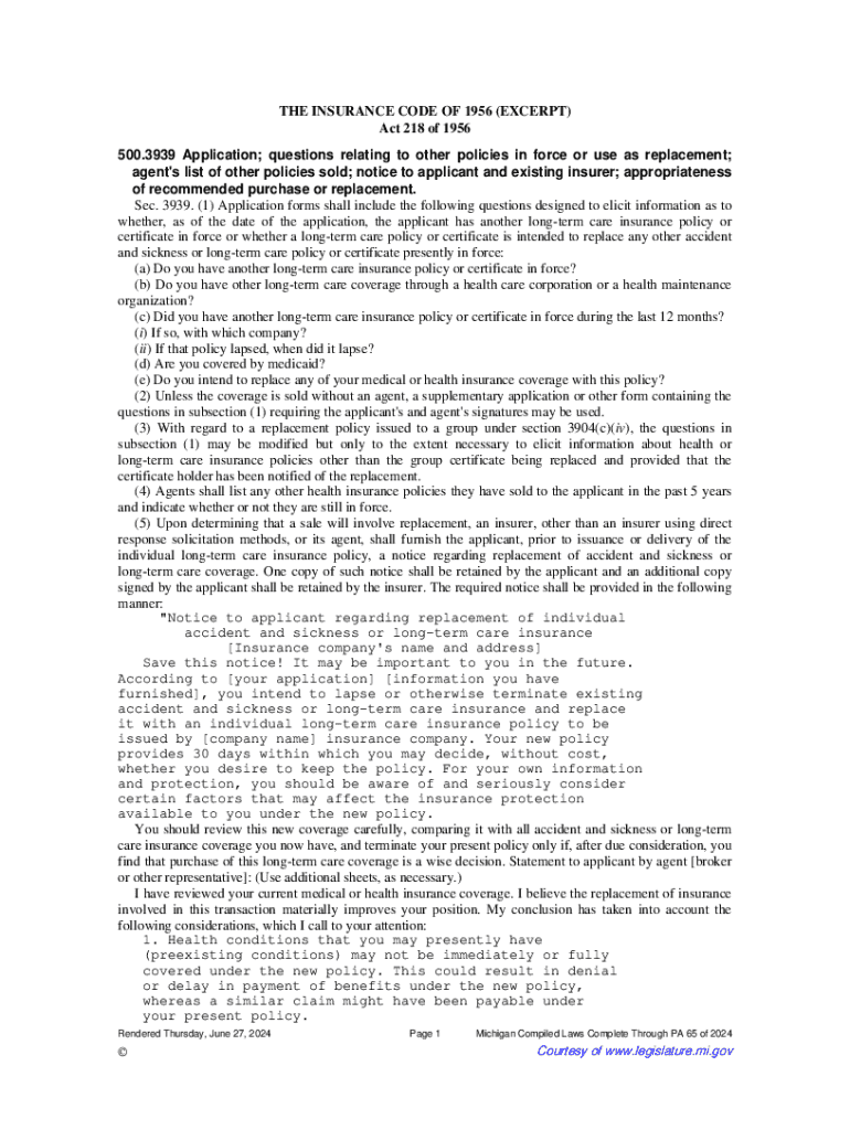 THE INSURANCE CODE OF 1956 (EXCERPT) Act 218 of 1956 500.3939 Application; questions relating to other policies in force or use as replacement; agent\'s list of other policies sold; notice to applicant