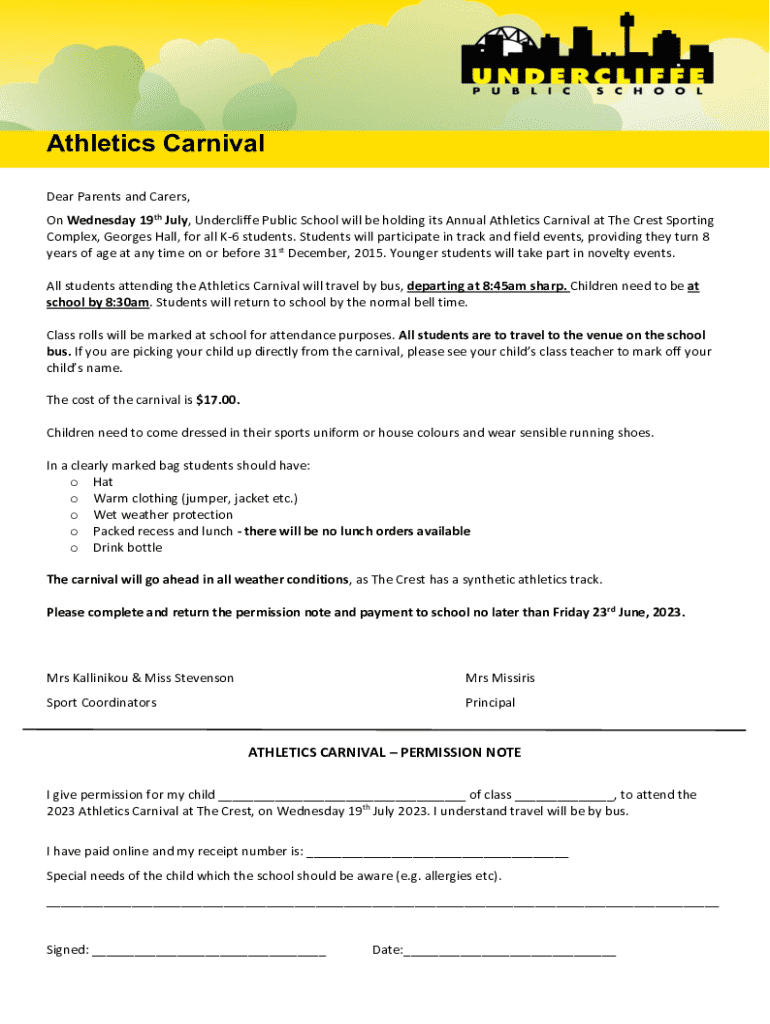 Athletics Carnival Dear Parents and Carers, On Wednesday 19th July, Underlie Public School will be holding its Annual Athletics Carnival at The Crest Sporting Complex, Georges Hall, for all K6 students.