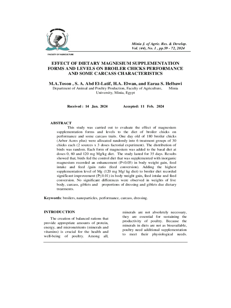 Minia J. of Agric. Res. & Develop. Vol. (44), No. 1 , pp.59 72, 2024 FACULTY OF AGRICULTUREEFFECT OF DIETARY MAGNESIUM SUPPLEMENTATION FORMS AND LEVELS ON BROILER CHICKS PERFORMANCE AND SOME CARCASS