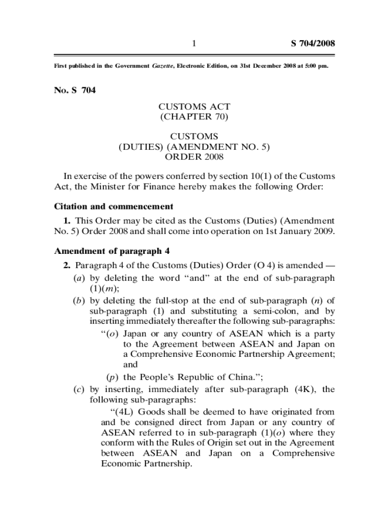 1S 704/2008First published in the Government Gazette, Electronic Edition, on 31st December 2008 at 5:00 pm.NO. S 704 CUSTOMS ACT (CHAPTER 70) CUSTOMS (DUTIES) (AMENDMENT NO. 5) ORDER 2008 In exercise