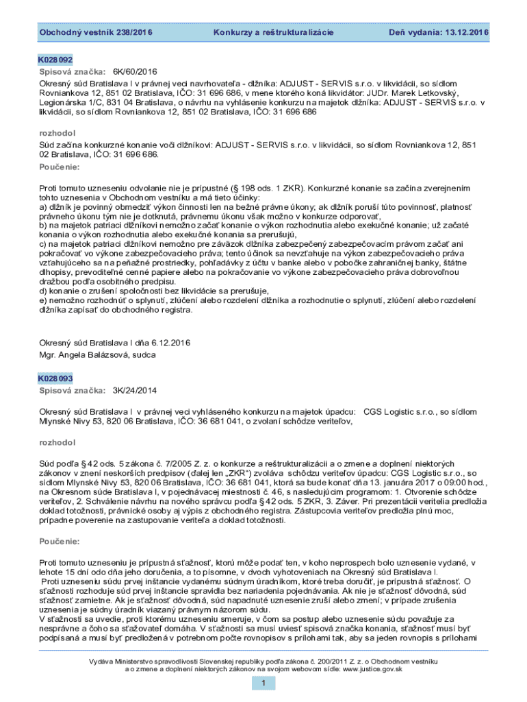 Ores SD Bratislava I v prone VCI navrhovatea DLNA: ADJUST SERVES s.r.o. v likvidcii, so slow