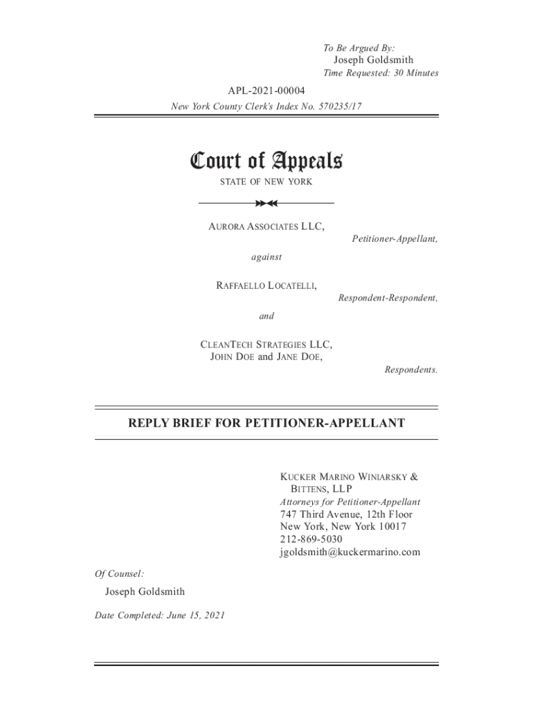 To Be Argued By:Joseph Goldsmith Time Requested: 30 MinutesAPL202100004 New York County Clerks Index No. 570235/17Court of Appeals STATE OF NEW YORK AURORA ASSOCIATES LLC, PetitionerAppellant, againstRAFFAELLO