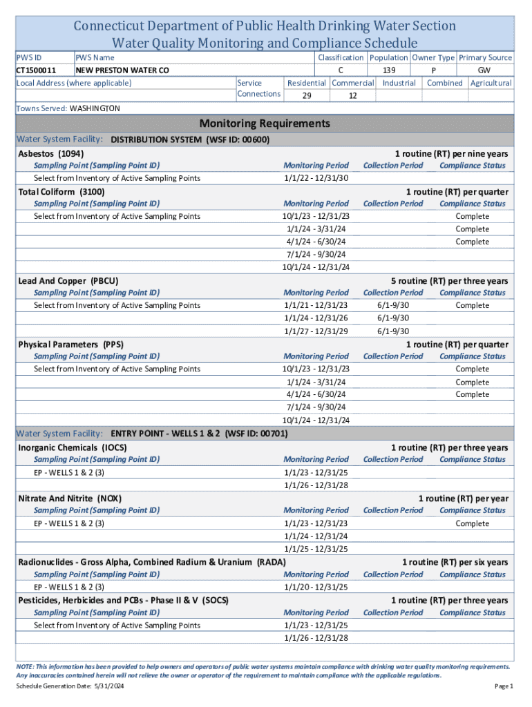 Connecticut Department of Public Health Drinking Water Section Water Quality Monitoring and Compliance Schedule PCs ID PCs Name CT1500011 NEW PRESTON WATER CO Local Address (where applicable)Classification