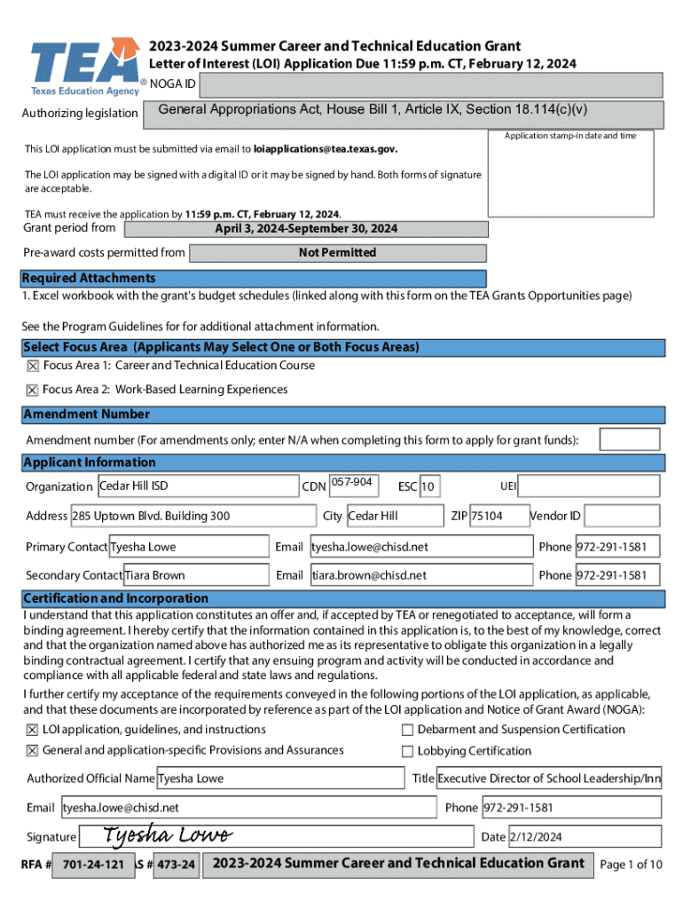 20232024 Summer Career and Technical Education GrantLetter of Interest (LOI) Application Due 11:59 p.m. CT, February 12, 2024,
