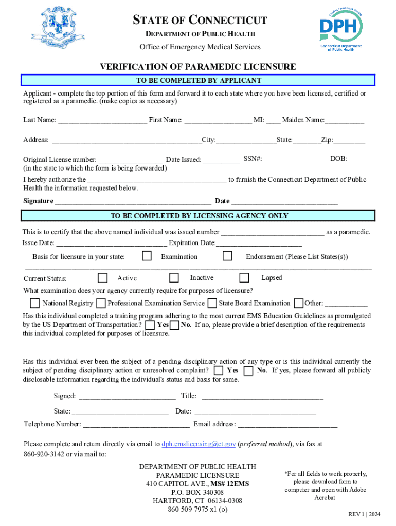 STATE OF CONNECTICUT DEPARTMENT OF PUBLIC HEALTH Office of Emergency Medical ServicesVERIFICATION OF PARAMEDIC LICENSURE TO BE COMPLETED BY APPLICANT complete the top portion of this form and forward