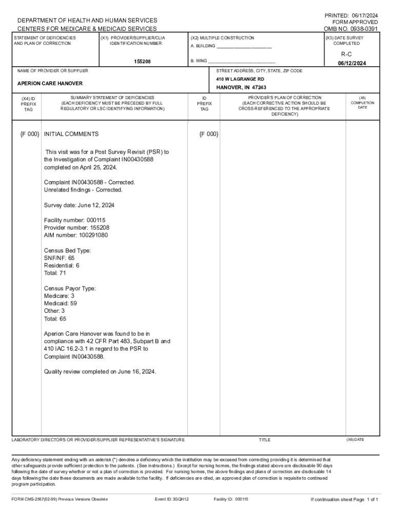 AND PLAN OF CORRECTION(X1) PROVIDER/SUPPLIER/CIA
