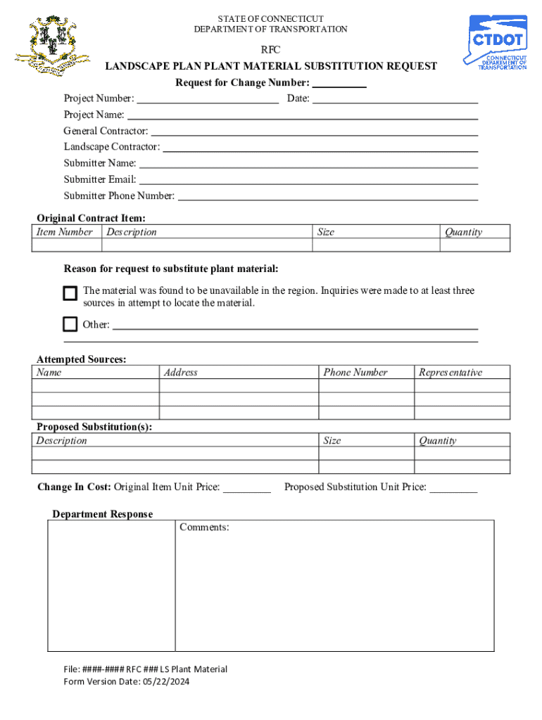STATE OF CONNECTICUT DEPARTMENT OF TRANSPORTATION RFC LANDSCAPE PLAN PLANT MATERIAL SUBSTITUTION REQUEST for Change Number: Project Number: Date: Project Name: General Contractor: Landscape Contractor: