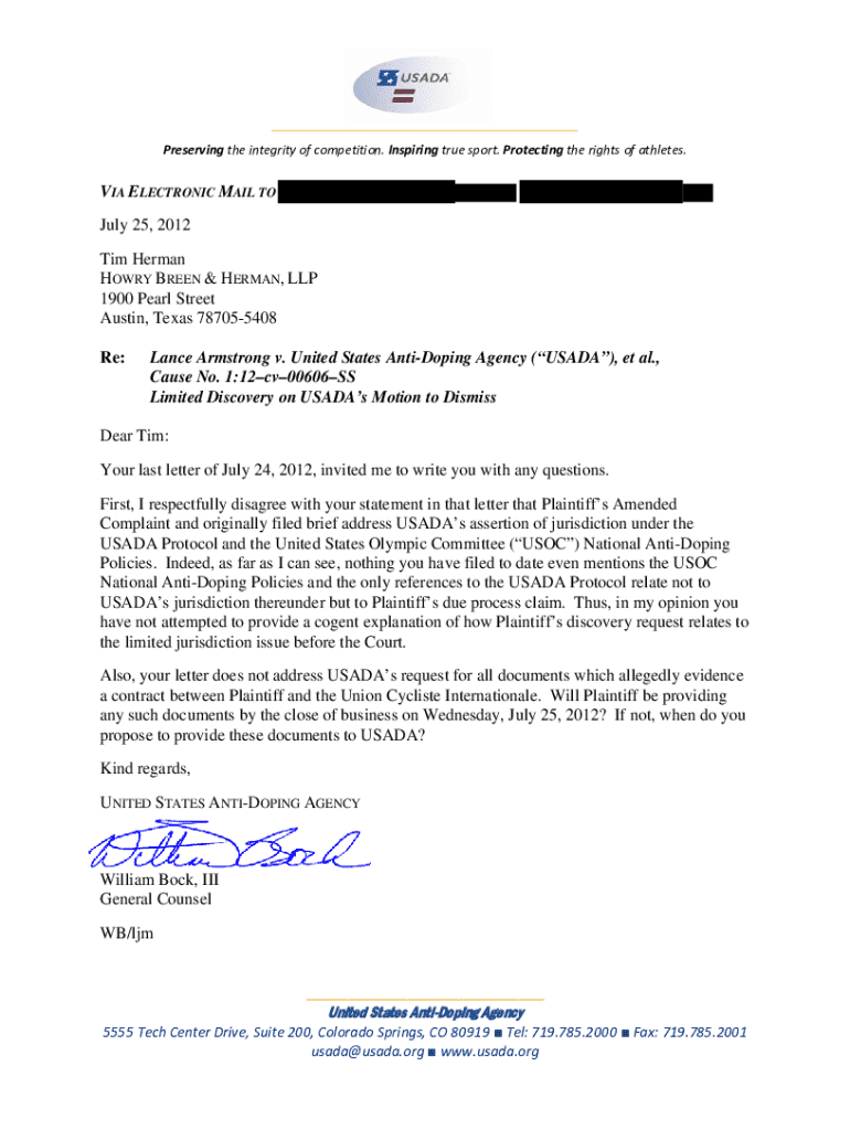 Preserving the integrity of competition. Inspiring true sport. Protecting the rights of athletes. VIA ELECTRONIC MAIL TO